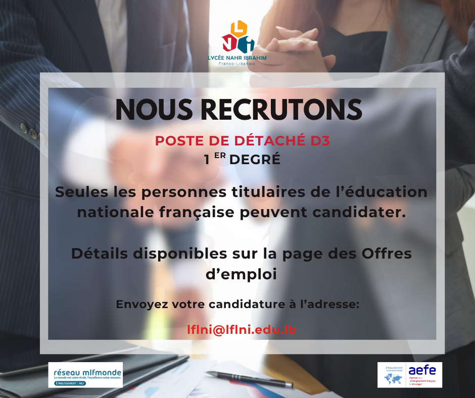 Recrutement des détachés pour la rentrée scolaire 2026 21 / octobre Établissement Eliane Maalouf 0 Comments Rendez-vous sur notre page ‘Offres d’emploi’: https://www.lflni.edu.lb/actualites/offre-demplois/